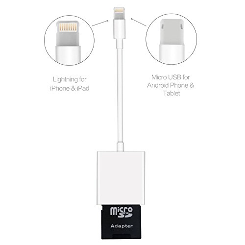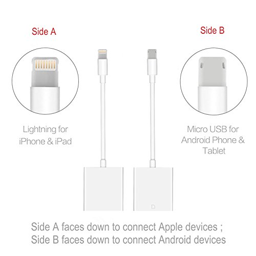 2 in 1 Connector -- The SD card camera reader with 2 in 1 connector, one side is suit for android micro USB, the other side fits for iPhone connector. It is suitable for both iphone phones and android phones. (pls connect it to iphone/ipad with the side A upwards, and Android devices with side B upward ).