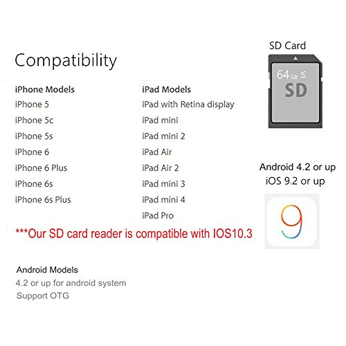The System Requires -- IOS 9.2 or up to Newest System 10.3.1 , 4.2 or up for android system. The SD card camera reader is compatible with Secure Digital memory cards, Mini and Micro SD are supported Support Format: JPEG/RAW/H.264/ MPEG-4, when used with an adapter to fit the slot. Supporting SD card capacity less than 64GB ( pls note SD card is not included. )