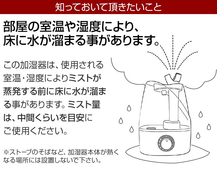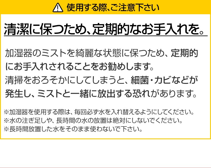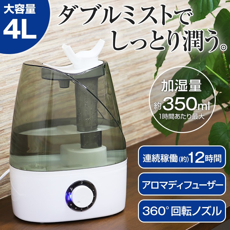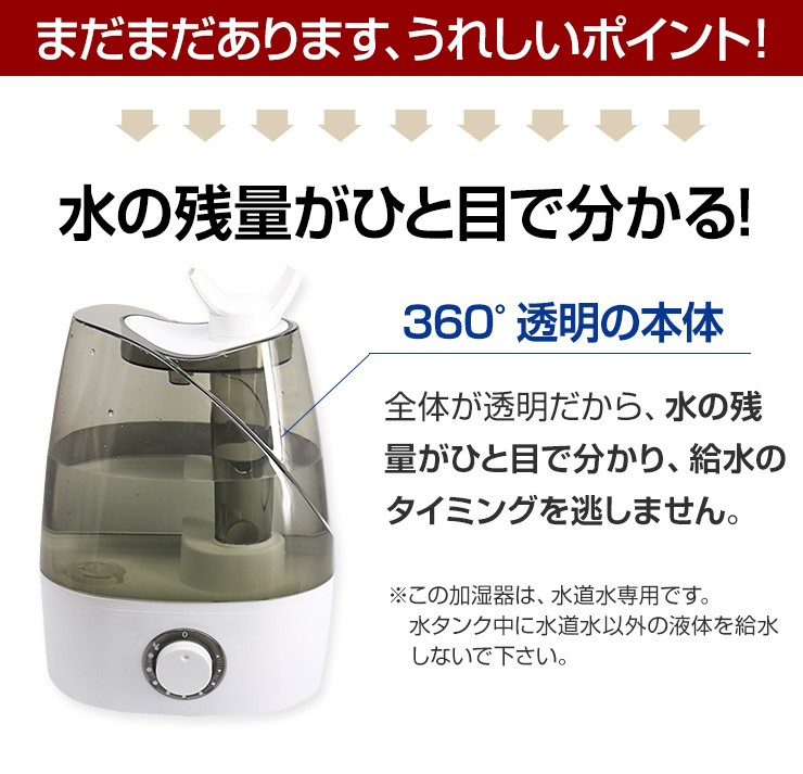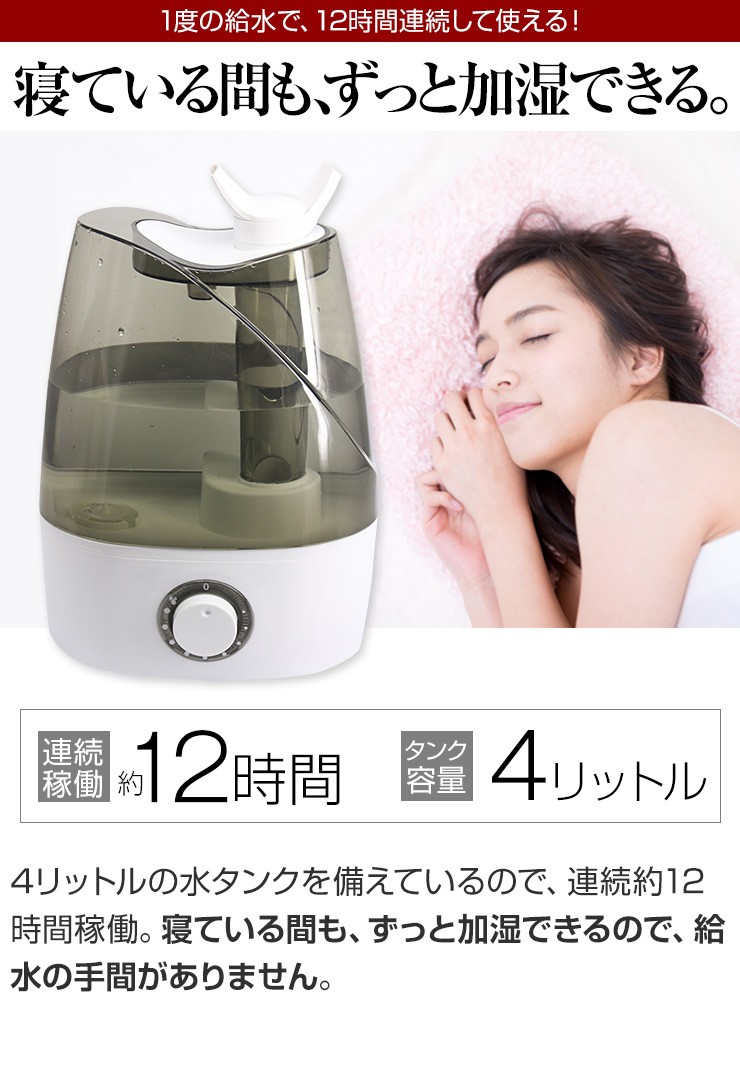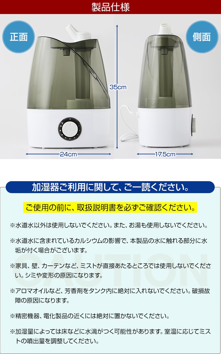 定格電圧:100V 50/ 60Hz消費電力:25W電流ヒューズ:2Aサイズ:約24×17.5×35 cmタンク容量:4L加湿量:最大約350ml適用床面積:20平方メートル噴霧方式:超音波振動加湿方式材質:ABS樹脂、ポリプロピレン重量:約1120g使用時間:約12時間運転音:35dB以下コード長:約104cm保証期間:ご購入日より180日間※本製品は水道水専用です。※本製品のミスト発生装置は交換式ではありません。デジキン