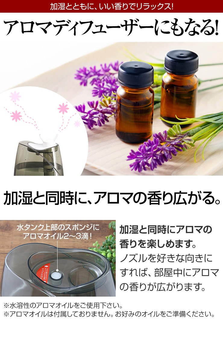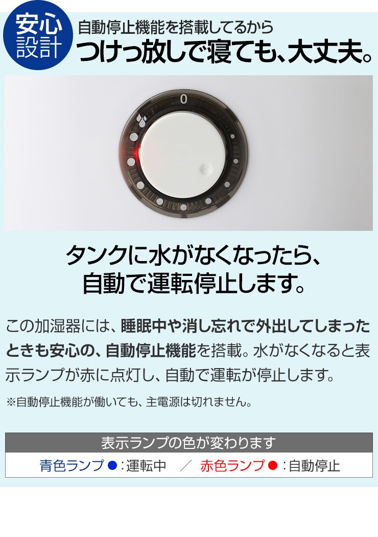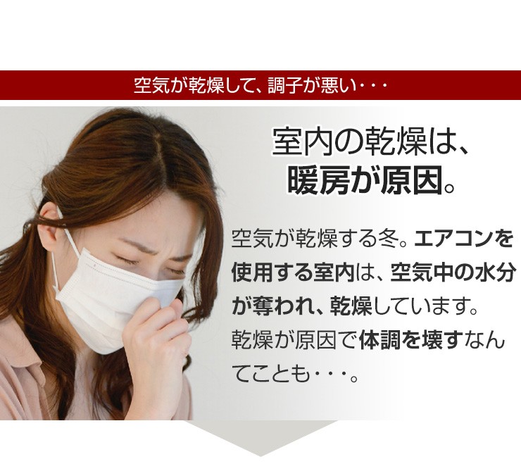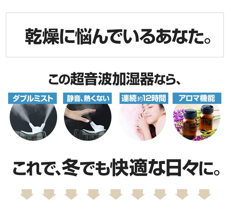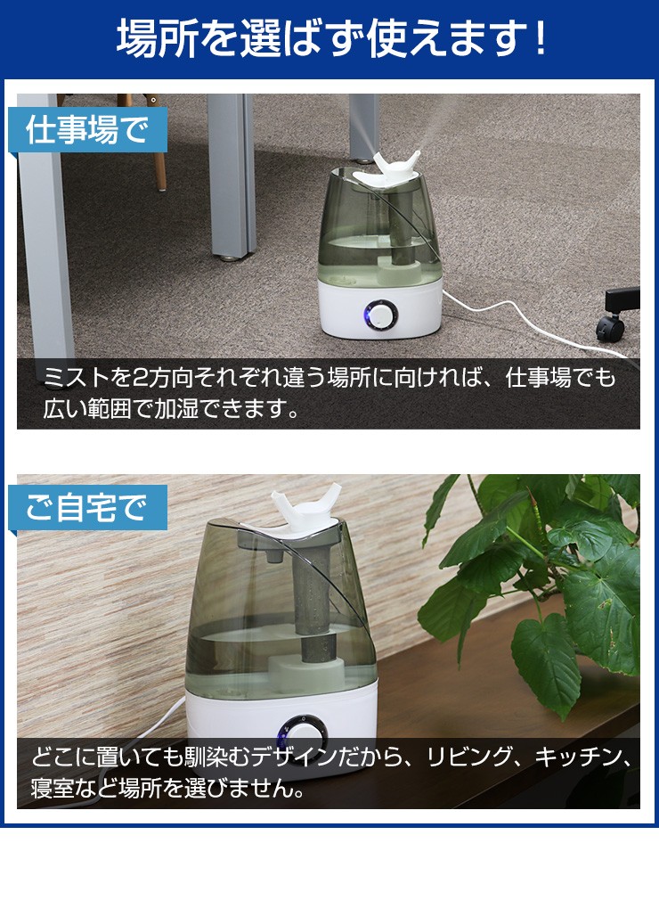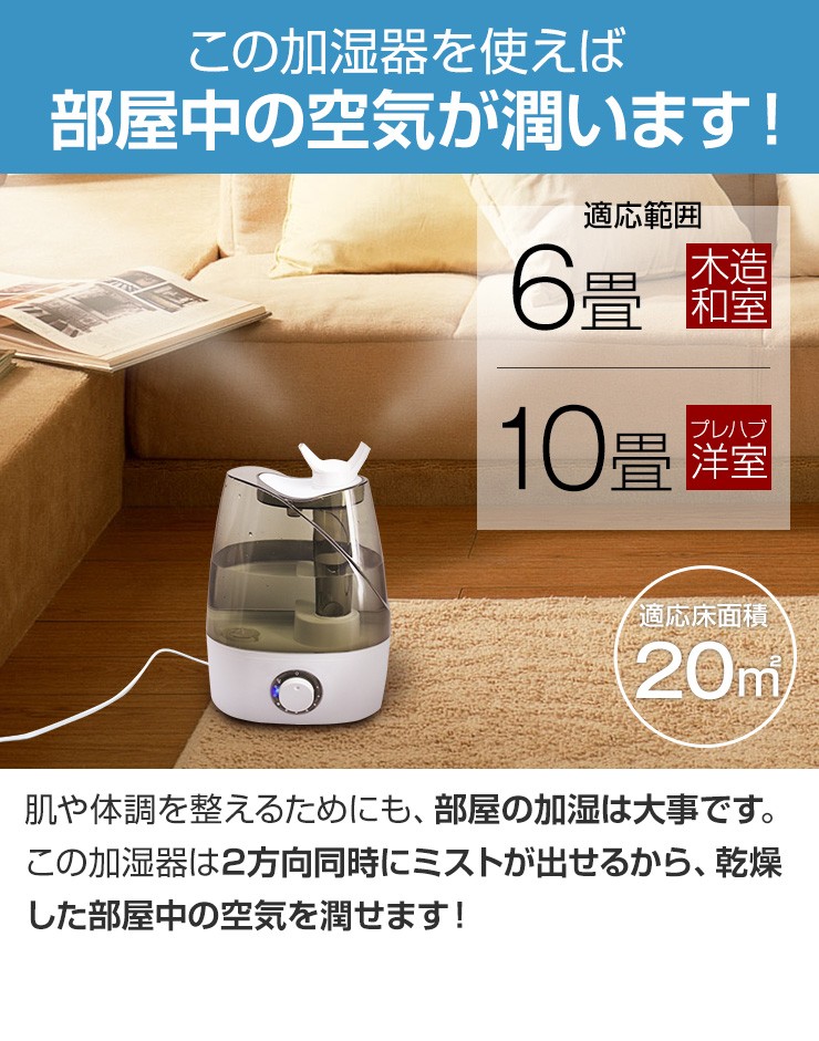 定格電圧:100V 50/ 60Hz消費電力:25W電流ヒューズ:2Aサイズ:約24×17.5×35 cmタンク容量:4L加湿量:最大約350ml適用床面積:20平方メートル噴霧方式:超音波振動加湿方式材質:ABS樹脂、ポリプロピレン重量:約1120g使用時間:約12時間運転音:35dB以下コード長:約104cm保証期間:ご購入日より180日間※本製品は水道水専用です。※本製品のミスト発生装置は交換式ではありません。デジキン