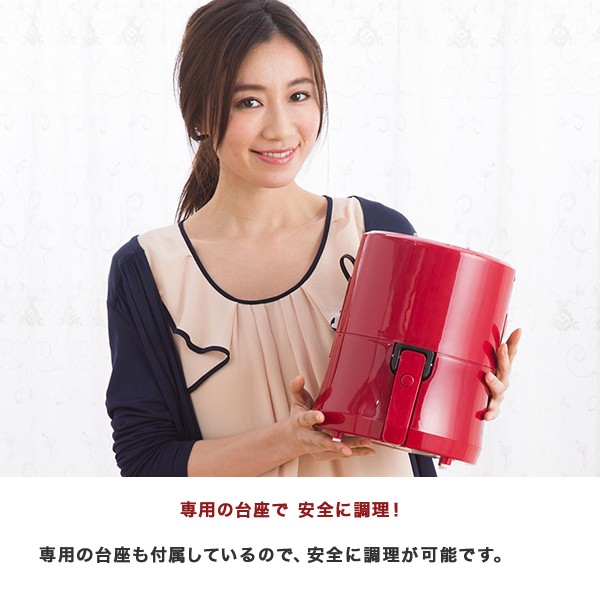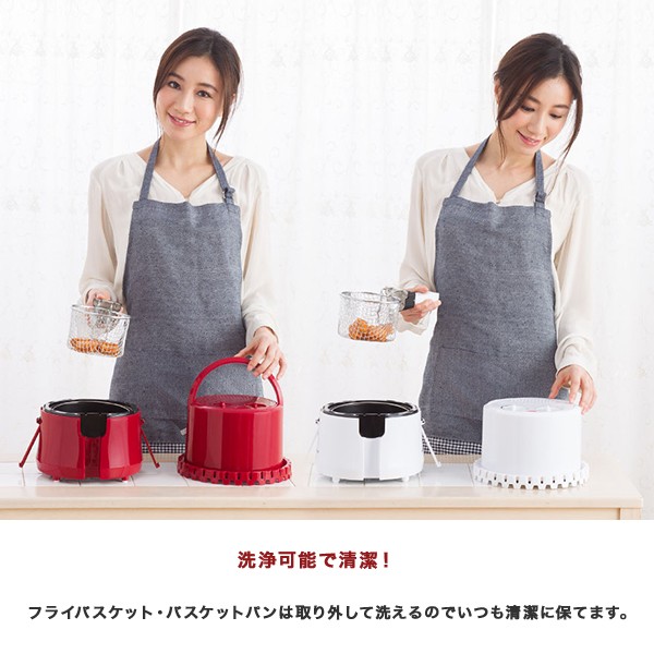| 商品説明 | 熱と空気でカラット揚がるゼロフライヤー。 これからの揚げ物はヘルシー志向! ヘルシー志向の方に おすすめ! 本体上部の加熱ヒーターとファンで熱風を庫内に循環させ、食材を外はカラッと中はジューシーに揚げることができます。 油なしで調理ができるのでヘルシー志向の方におすすめです。 断然早い調理時間 コンパクトサイズなので庫内温度の上昇が早く、一般的なオーブンより断然早く調理が可能です。使い方はとってもシンプル。 最大30分まで調理時間を設定でき、温度設定は120℃~200℃まで可能。 様々な調理が可能! 小さめのトースト・トンカツ・唐揚げ・フライドポテト・グラタン・焼きおにぎりなど、様々な調理が短時間で行うことができ、 冷凍食品などはカラッと揚げることができますので、余分な油を落としつつ食感を損ねることなくヘルシーに美味しく食することができます。 コンパクトサイズで 持ち運びもラクラク 約幅21.4x奥行22.9x高さ26.7cmとコンパクトサイズで置き場所に困りません。 本体上部には取っ手も搭載されているので、持ち運びもラクラク。 専用の台座で 安全に調理! 専用の台座も付属しているので、安全に調理が可能です。 洗浄可能で清潔! フライバスケット・バスケットパンは取り外して洗えるのでいつも清潔に保てます。 |