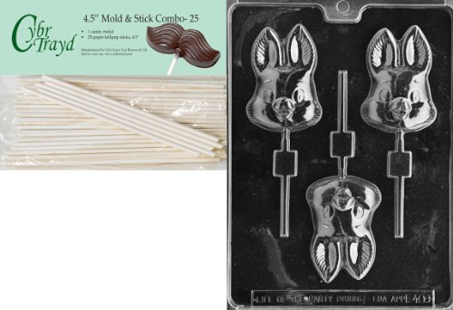 Cybrtrayd Cute Bunny Lolly Bunny Head Easter Chocolate Candy Mold with 25 4.5-Inch Lollipop Sticks