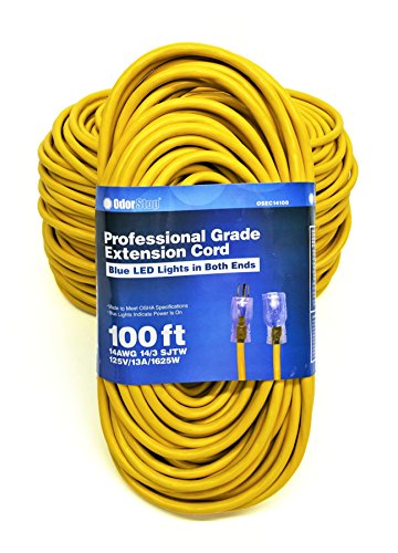 OdorStop OSEC14100 - 100' Yellow 14/3 SJTW Professional Grade Extension Cord with Blue LED Lighted Ends