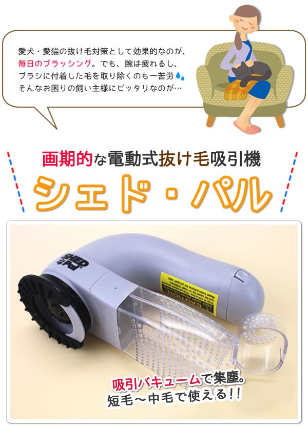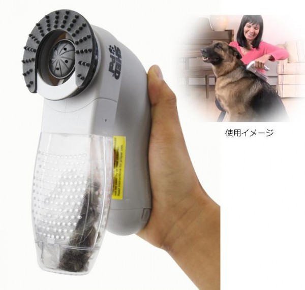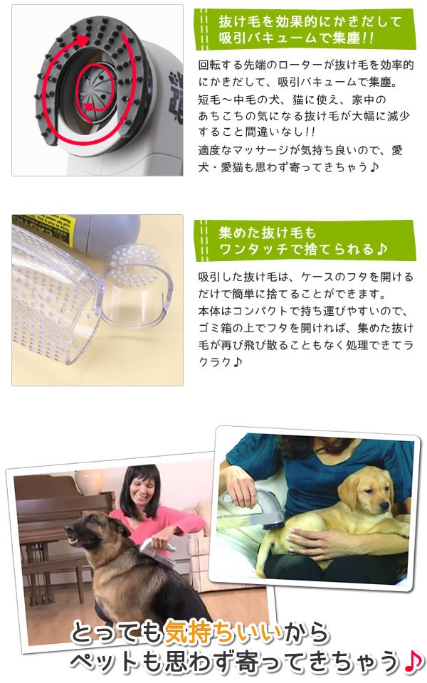 | <h1>回転する先端のローターが抜け毛を効率的にかきだして吸引バキュームで集塵。短毛~中毛の犬、猫に使え、家中のあちこちの気になる抜け毛が大幅に減少すること間違いなし!!気持ち良いので思わず愛犬・愛猫も近寄ってきます。コンパクトで持ちやすく、抜け毛もワンタッチで捨てられます。</h1> |
