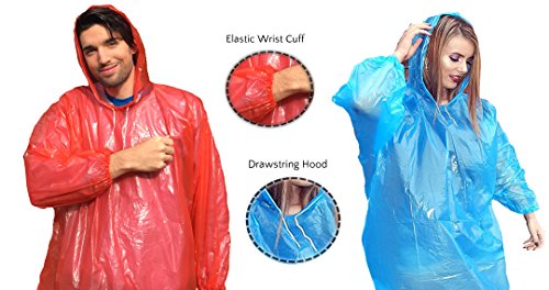 -. Feature : ALWAYS BE PREPARED FOR EMERGENCIES:The next time you'll be hiking, camping,and having fun in an amusement park, a festival or a sport event, don't panic if it starts raining! Just wear the disposable rain ponchos that you always carry with you for cases of emergency, and you will remain dry and clean! So if you enjoy outdoor activities throughout the whole year,get the pack of 6 disposable rain jackets and have one with you at all times! / DESIGNED TO KEEP YOUR ENTIRE BODY DRY:Long raincoat design, full length sleeves, elastic sleeve cuffs, hood with drawstring -these disposable ponchos have been specially and smartly designed to cover your entire body! Not even a drop of rain will manage to pass through the Perfect Poncho plastic rain ponchos, so you can wear them even when it's raining cats and dogs! When you'll get home, your clothes will be 100% dry! / EXTRA-THICK AND DURABLE MATERIAL:While most disposable rain ponchos on the market are made with 0.02 mm thick plastic, the Perfect Poncho disposable raincoats are 0.03 mm thick.These rain ponchos may be disposable, however, we wanted to make sure that when you will wear them, they will be durable and keep you dry for the whole day. These extra-thick plastic raincoats are the best investment you can make today! / SO LIGHT YOU'LL FORGET YOU'RE WEARING IT:Even though the Perfect Poncho waterproof rain ponchos are extra-thick, the plastic material is nonetheless unbelievably lightweight. In fact, it is so lightweight that it is not a burden to carry around and you barely feel it on you when you're wearing it. Try one of our disposable raincoats on and see for yourself! And when it stops raining, don't forget to throw the used poncho in the recycle bin! / A ONE SIZE FITS ALL UNISEX DESIGN: Perfect Poncho has created these disposable waterproof raincoats for both men and women. All 6 rain ponchos (2 red, 2 green, 2 blue) of the pack are one size fits all, and they have the most comfortable baggy fit! So wear it over your clothes and jacket and be sure that everything -including the valuable contents of your pockets -will remain in excellent condition. Maybe it's time to replace your umbrellas...just saying!