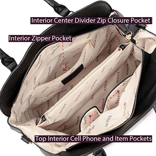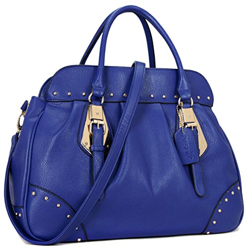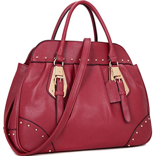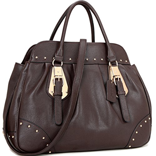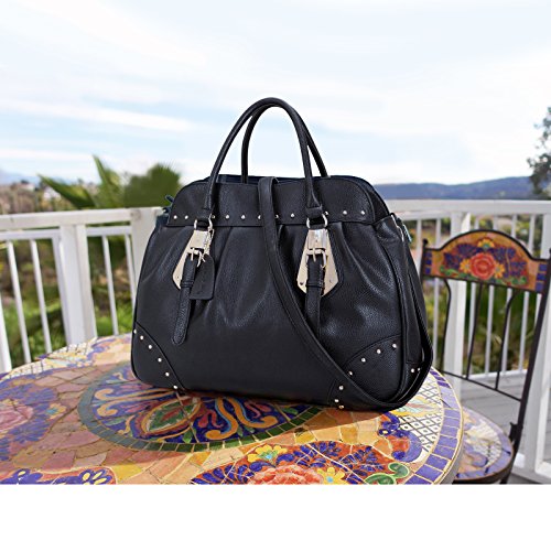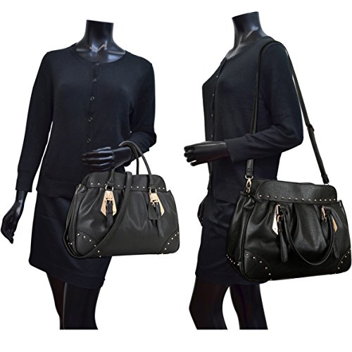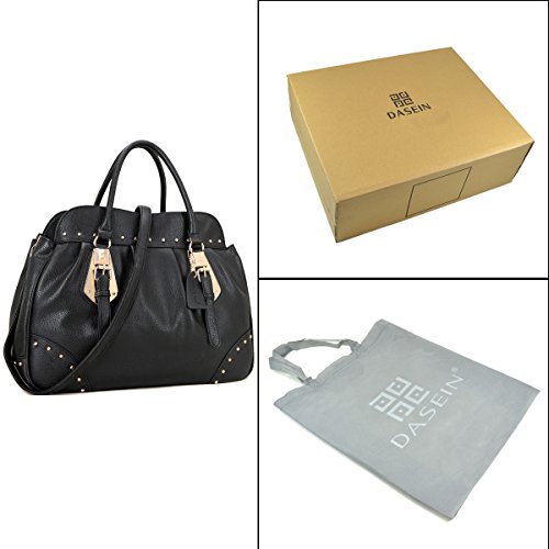 This faux leather studded satchel is just as chic as it is functional. With gold-tone studs, this bag is a brilliant expression of fresh elegance. Fully-line fabric interior, removable shoulder strap and convenient flat bottom for easy stand up, will keep you stepping from the runway to the office!Why Buy from Dasein?