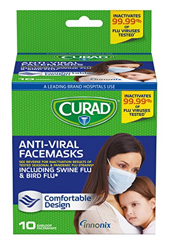 Antiviral medical face masks offer an easy breathing, comfortable design for your face along with safe, high-barrier protection. Curad inactivates 99.99 percent of tested influenza viruses within five minutes contact with the surface of the facemask. Tested on specific seasonal flu viruses Pandemic H1N1, Avian, Swine and Equine, this universal, standard flat mask with pleats has a hydrophilic plastic coating that rapidly absorbs aerosol droplets away from the outer surface of the mask. The first and second layers of the mask are treated with different compounds that inactivate influenza viruses. Rapid absorption ensures the influenza A and B viruses are wicked away from the outer surface. In the outer active layer, viruses are inactivated by exposure to a low pH environment meets ASTM F2100-07 standard: High-Barrier surgical facemask.Feature