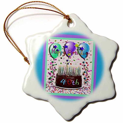 3dRose orn_20208_1 Happy Birthday 40th Chocolate Cake Snowflake Ornament, Porcelain, 3-Inch
