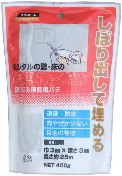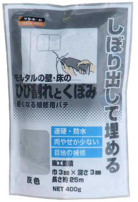 | モルタルのひび割れくぼみの補修材です。水と混ぜる必要が無く、このまましぼり出して使えます。ダレにくいので壁面の補修にも使えます。水性ですから低臭で、速乾です。(夏季約3時間、冬季約6時間、内部完全硬化約24時間)タイルの目地の補修にも使えます。3mm×3mm×約25m(目安)の補修ができます。常時浸水する箇所は補修しないでください。金具などの固定には使用しないでください。 |