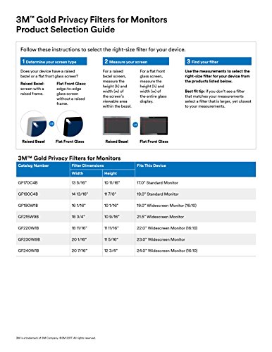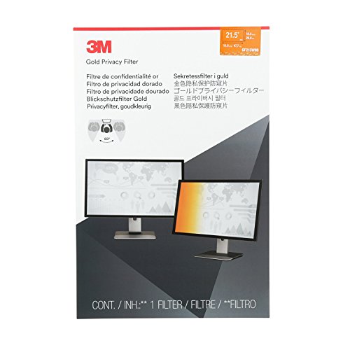 -. AspectRatio : 16:9 -. Binding : Personal Computers -. Brand : 3M -. Color : Gold, Transparent -. EAN : 0051128006856 -. Feature : Keeps your personal or confidential information safe from prying eyes / Designed to fit widescreen monitors with a diagonally measured 21.5" viewing screen and a 16:9 aspect ratio / Actual filter dimensions are 18 3/4" x 10 9/16" (477 mm x 268 mm) / Offers the highest level of clarity within 3M's line of P.R.Ivacy filters / Reversible, P.R.Ivacy filter can be used with either gold or black side facing the user -. Label : スリーエム(3M) -. Manufacturer : スリーエム(3M) -. Model : GF215W9B -. MPN : GF215W9B -. NumberOfItems : 1 -. PackageQuantity : 1 -. PartNumber : GF215W9B -. ProductGroup : Personal Computer -. ProductTypeName : COMPUTER_INPUT_DEVICE -. Publisher : スリーエム(3M) -. Studio : スリーエム(3M) -. Title : 3M Gold P.R.Ivacy Filter for 21.5" Widescreen Monitor (GF215W9B) -. UPC : 051128006856 -. Warranty : Limited 1-year warranty