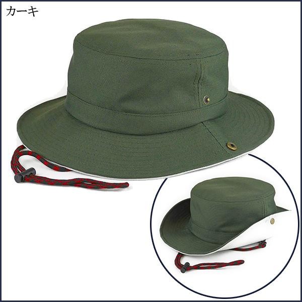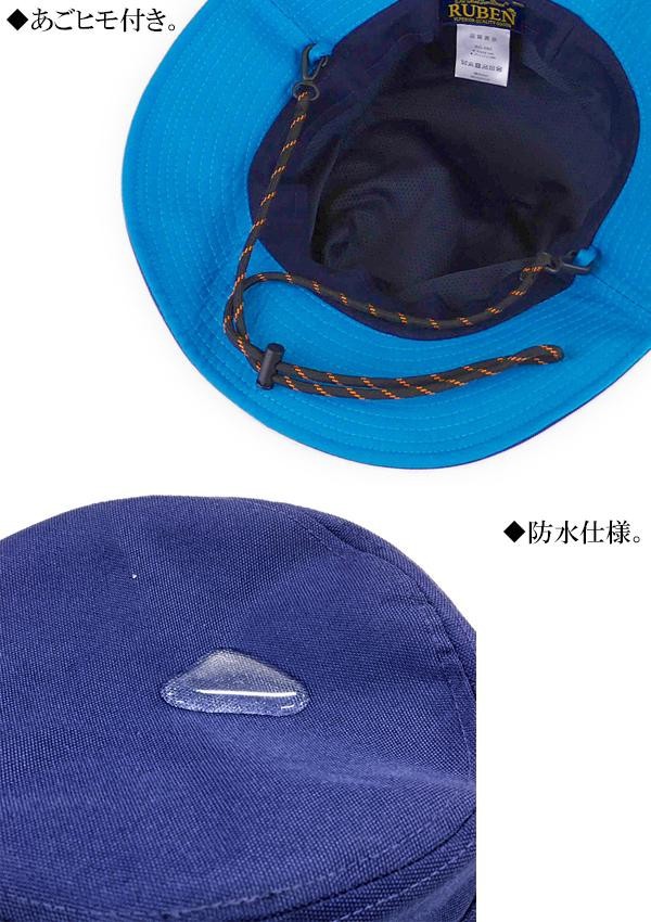 サイドのボタンを留めることも出来るので、2通りの被り方が楽しめます。あごヒモも付いているのでアウトドアでも大活躍!!表面にコーティングを施した防水仕様ですので、雨が降っても大丈夫♪ |