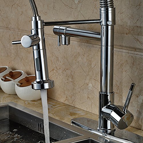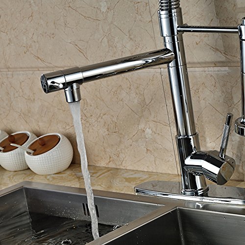 Both high-arc sprayer spout and pot filler can swivel 360° for easy access and use for two sinks
