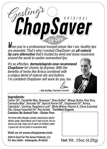 Chop saver is a natural alternative for lip care needs. The formula is so effective, it is recommended by dermatologists for patients with chronic lip problems. Chop saver is 100% natural. It combines the goodness of herbs with nature's finest ingredients such as shea and mango butter, aloe, vitamin e and herbs known for their ability to fight chapping, swelling and soreness. Chop saver feels great the moment you put it on. The fragrance is a light, refreshing blend of four citrus oils. Chop saver contains no animal fats, no petroleum and no harsh chemicals which are commonly found in other lip balms. Chop saver is gluten free. Chop saver relieves the painful symptoms of chapping, swelling, soreness, fatigue and inflammation of the lips caused by playing brass or woodwind instruments. Make chop saver part of your daily routine. Save your chops with chop saver.Feature