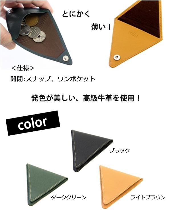 FRUHの大ヒットシリーズ「スマートウォレット」から待望のコインケースが登場!上質な日本製の牛革を使用して丁寧に作り上げたコインケースは使い勝手も考えられたトライアングル形状でインパクトもあります。小銭が少ないときは本当に薄くなります。ポケットに入れる機会が多いコインケースはなにかと場所を取りたくないもの。そんな悩みに答えてくれる逸品です。 |