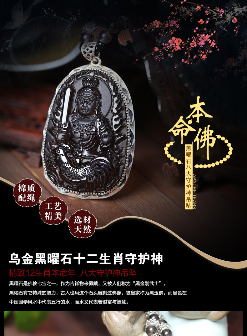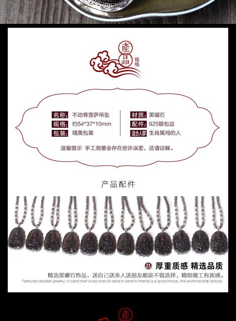 开光冰种黑曜石925银不动明王十二生肖属鸡本命佛守护神吊坠