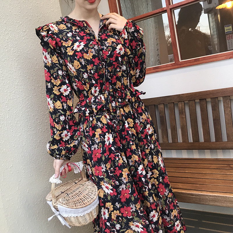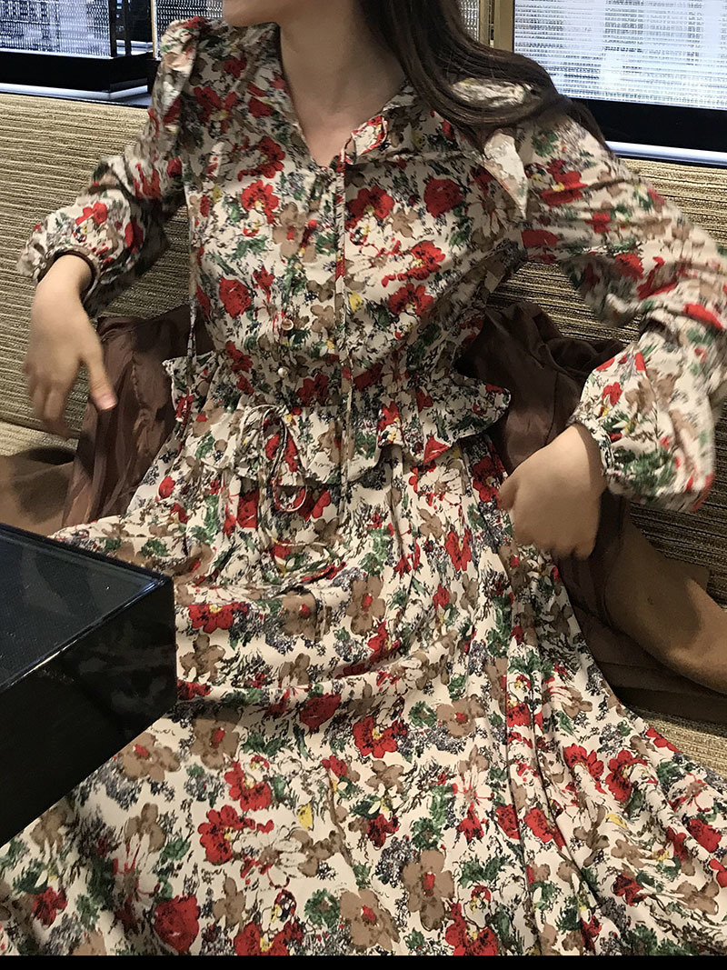 ワンピース 花柄 フリル 前ボタン レトロ カジュアル