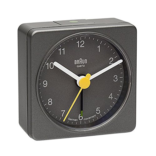 Braun Square Analog Travel Alarm Clock. Braun Alarm clocks have a reputation of being functional, reliable and very nice to look at. Back by popular demand, the classic clocks are largely re-editions of the favorite older styles: Back by popular demand, the classic clocks are largely re-editions of the favorite older styles: this alarm clock has a a compact square style. This well-crafted clock features an on/off flip-up switch, easy to set clock and crescendo alarm. This is a best seller. Materials: ABS Plastic. Product Dimensions: 2.25" L x 2.25" W x 1.1" H. Weight 0.30 lbs.