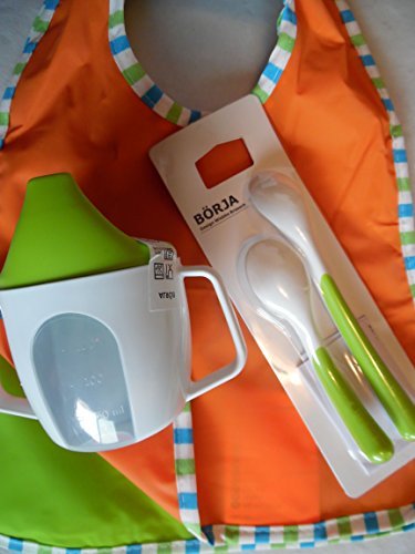 -. Binding : Baby Product -. Brand : Baby Gift Set -. EAN : 0099396511368 -. Feature : All in one: 2 baby peva bib, 1 cup 2 spoons from ikea / easy to clean Care instructions . Dishwasher-safe up to 158ºF (70°C). Microwave-safe; heat food up to 200°F / 2 large handles make it easy for babies to hold and control the beaker and drink by themselves. Tight-fitting lid to prevent messy spills. / can see how much is left in the beaker through the transparent plastic ,easy to refill / beautiful colors -. Label : ikea -. Manufacturer : ikea -. PackageQuantity : 3 -. ProductGroup : Baby Product -. ProductTypeName : BABY_PRODUCT -. Publisher : ikea -. Studio : ikea -. Title : Ikea's Baby Gift Set: Kladd Randig Bib, Green & Orange 1 Borja Feeding Baby Trainer Cup & 1 Borja Pack of 2 Feeding Spoons -. UPC : 099396511368