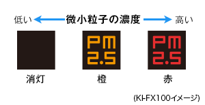 PM2.5 등 미세 입자의 농도 (기준) ※ 색상으로 알기 쉽게 알려 풍량을 강화하고 먼지합니다. * PM2.5는 2.5μm 이하의 미소 입자상 물질의 총칭입니다. 외부 공기로부터의 배기 가스와 실내의 담배와 조리시 발생하는 연기 등에도 포함되어 있습니다.
