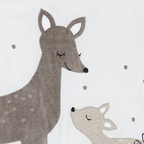 -. Feature : This charming three piece bedding set includes one comforter, one fitted crib sheet, and one dust ruffle. The comforter features our sweet mommy and baby deer on a soft brushed twill background. / Intricate embroidered leaves and feathers surround the comforter and are finished with a double braided exquisite border. The shirred dust ruffle includes embroidered foliage, has a 14.5" drop, and is a cotton poly blend. / The fitted crib sheet is 100% cotton featuring deer, leaves, and feathers in warm earth tones. The sheet has an extra deep pocket on the bottom to ensure a perfect fit. Designed to fit a 28" by 52" crib mattress. / Care Instructions: Machine wash cold with like colors. Gentle cycle. Do not bleach. Tumble dry low. Iron on lowest setting as needed. Do not iron dust ruffle platform. Imported.
