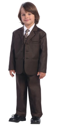 A handsome suit outfit for your boy. This brown suit comes with a 3 pocket jacket, white button down long sleeve shirt, matching button down vest and pants with a stylish coordinating tie. The perfect suit for church, holidays, weddings, first communion and other special occasions.