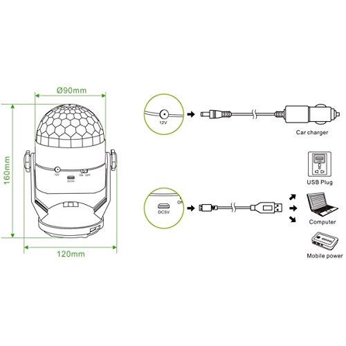 Newest Updated Version Mini Micro USB stage light, designed with 5V Micro USB Port that can connect with any power source like computer, power bank, 12V DC interface could connect with US Plug Adapter. And also 3AAA battery can be used directly ( Not Included)