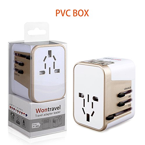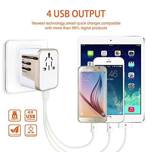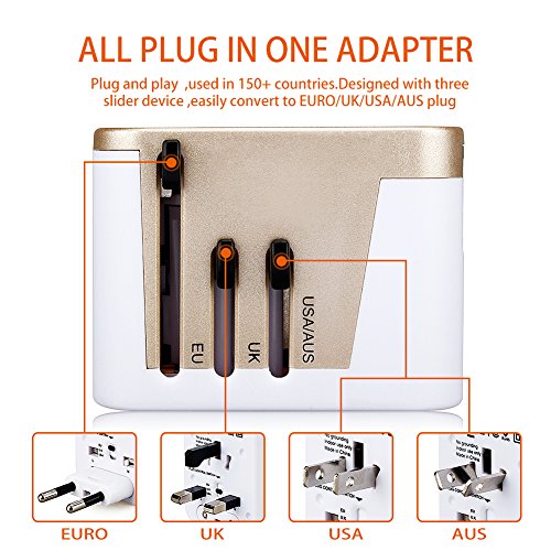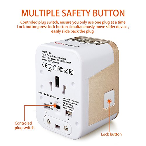Wontravel Universal Travel Adaptor plug with 4 USB Charging Ports for EU/US/AU/UK (White with golden)
