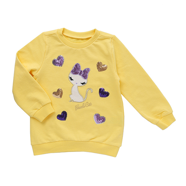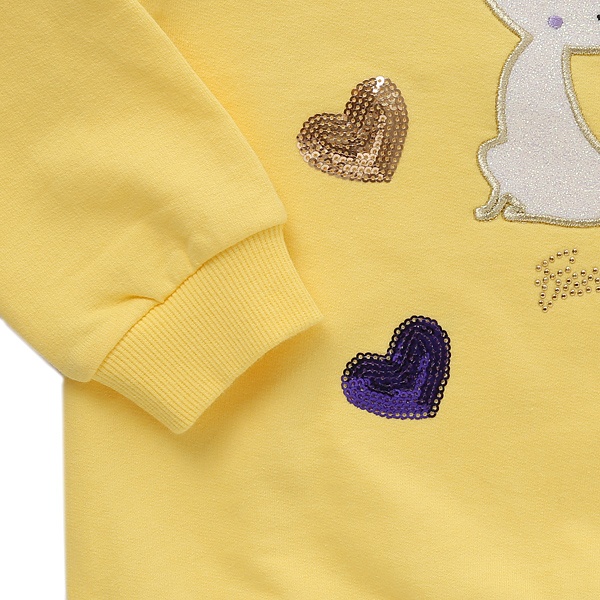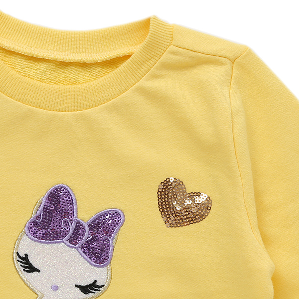 상품설명 옐로 하트자수 롱티셔츠입니다. 산뜻한 컬러감이 눈에 딱 띄는 제품인데요. 리본달린 고양이와 스팽글 하트자수로 블링블링함을 더해준 제품입니다.