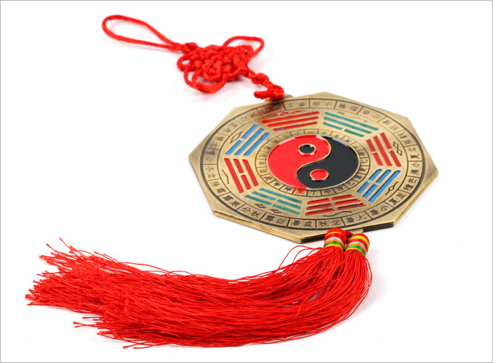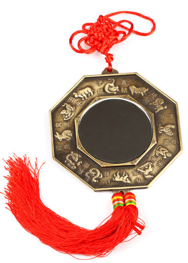 八卦镜也叫太极八卦镜:在我国一直被称为风水吉祥物。据传,在距今七千年前的上古时代,伏羲氏观物取象,始作八卦。"以通神明之德,以类万物之情。"《易·系辞传》说:"易有太极,是生两仪,两仪生四象,四象生八卦。"太极就是一,就是道,是元气浑然之象,是造分天地的根源。