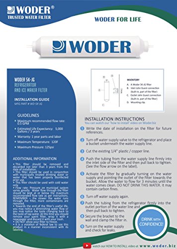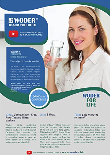 -. Feature : GO MAINTENANCE AND REPLACEMENT FREE FOR LONGER: The Woder 5K inline cartridges last 3 years / 5,000 gallons, which is six (6!) times longer than your average refrigerator filter, who recommend being changed at least once every six months. Built with NSF approved materials (NSF61) tested by independent laboratories to NSF/ANSI 42 Protocols plus Lead. / SAFEGUARD YOUR KITCHEN, EASILY: With an important appliance like your refrigerator, you want to prevent leakage before it becomes a problem. The Woder® 5K Inline Water Filter uses quick-connect JG connectors that fit ALL refrigerators with copper or plastic ¼-inch tubing (NOT Braided) to ensure a watertight connection, so you can rest easy after installation. Plus the guide to install's a breeze! / ENJOY FEARLESS REFRESHMENT: You can trust the water and ice coming from your fridge when you've got a Woder® 5K Inline Water Filter connected. Woder filters are built with NSF approved materials (NSF61) and tested at independent laboratories to NSF/ANSI 42 protocols plus lead...so you never have to question the quality of your filtration system. / KEEP YOUR FAMILY SAFE: When municipal water reaches your house, it might contain any number of contaminants, from volatile organic compounds to heavy metals, and more. The Woder 5K remove Lead (99.9%), Heavy metals, Chlorine (99.9%) and other contaminants (99.9%), odors and bad tastes. It also removes Asbestos, Mercury and turbidity. / WODER'S "PERFECTION" GUARANTEE: Woder is so confident in the durability, ease-of-use and quality of the Woder 5K that it comes with a 100% No-Questions-Asked Money-Back Guarantee. So try the Woder 5K inline filter in your home today risk-free by clicking the "Add to Cart" button-you'll be happy you did