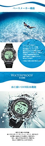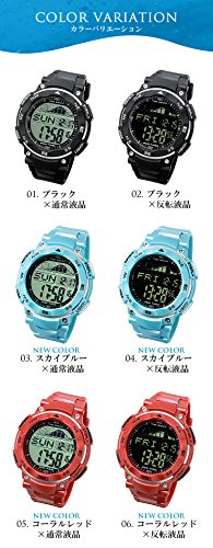 -. Feature : 全部で6色あります。 この商品は 04. スカイブルー(反転液晶)になります。 / 【仕様】 駆動方式:電池式 表示方式:デジタル 防水:100m防水 バックル:穴留め式/ピンバックル 【素材】 ケース:ABS樹脂/ステンレス ベルト:ポリウレタン 【サイズ】 ■ケースサイズ 約H60×W50×D15mm ■ベルト 腕回り:最小約16.8~最大約22.5cm ベルト幅:約22mm / 【付属品】 取扱説明書(日本語) 保証書 【種別】 新品未使用 正規品 メンズウォッチ/男性用腕時計 / 【機能】 ■時刻表示 ■カレンダー表示 ■タイドグラフ ・潮の様子をグラフ表示(干潮・上げ潮・満潮・下げ潮を7段階で表示) ・潮の状態をグラフ表示(大潮・中潮・小潮を3段階で表示) ・20か所のポイント登録 ・登録したポイントの潮の状態の確認 ・登録したポイントの満潮時間の予測 ■ムーンデータ ・月齢をグラフで表示(新月から満月まで16段階で表示) ・20か所のポイント登録 ・登録したポイントの月齢の確認 ■ペースメーカー ・1分間に警報を鳴らす回数を設定し、警報を鳴らす (例えば1分間に120回鳴らすように設定すると、0.5秒に1回、警報を鳴らす) / ■ワールドタイム ・世界35か国対応 ■ストップウォッチ ・ラップタイム計測(LAP1~LAP8まで計測可能) ・計測したラップタイムの確認 ・スプリットタイム計測(SPL1~SPL8まで計測可能) ・計測したスプリットタイムの確認 ・99:59:59まで計測可能 ■タイマー ・カウントダウンで時間の計測が可能 ・99:59:59まで計測可能 ・タイマーが残り60秒~10秒になると10秒ごとにアラームが鳴る ・タイマーが残り5秒を切ると毎秒アラームが鳴る ・0秒になるとアラームが鳴り、ボタンを押すまで止まらない ■アラーム ・アラーム×5本 ■ELバックライト ■サマータイムのON/OFF ■12/24時間表示の設定 ■100m防水
