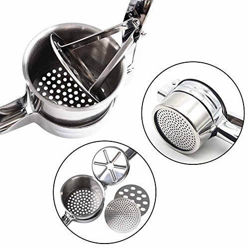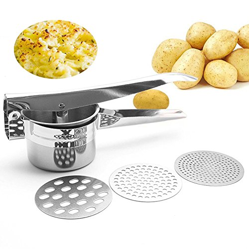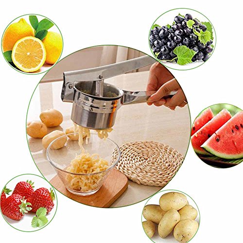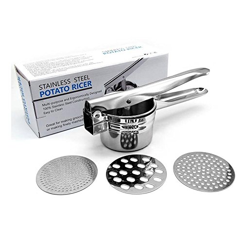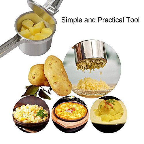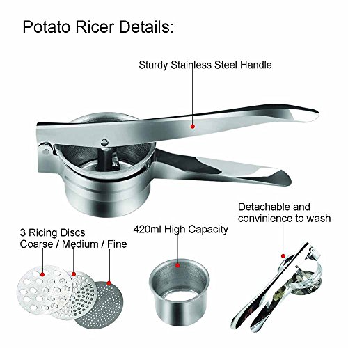 Selaurel Mash Potato Ricer Features: 1. Easy to use. Just place the ricer on any pot or bowl and squeeze the handles together to easily mash potatoes. 2. The large ricers are made of food grade stainless steel, in line with the EU LFGB and FDA with food-grade health standards, safe and healthy. . 3. Creates smooth purees from soft fruit, mashed vegetables, potato, homemade baby food with cooked apples, carrots and more. 4. Comfortably cushioned and ergonomically designed, making it a welcome relief for people with arthritis. 5. Non-slip handles holds ricer in place on bowls. 6. Convenient hanging hole that hooks onto any size bowl or pot. 7. Although the price is not expensive, we believe our masher quality is the best. 0
