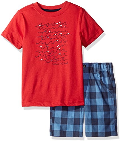 Nautica set which includes a short sleeve crewneck tee shirt and plaid shorts.