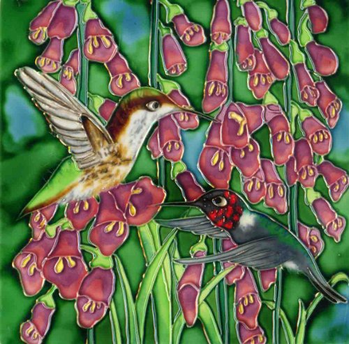 Continental Art Center BD-2019 8 by 8-Inch Two Hummingbirds with Purple Foxglove Flowers Ceramic Art Tile