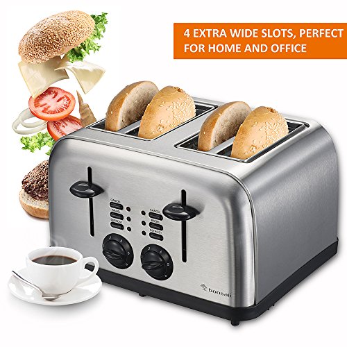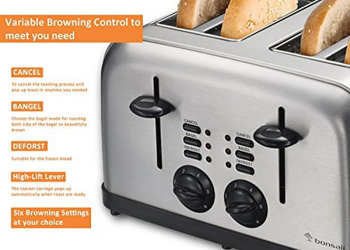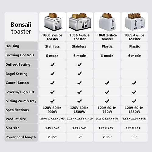 The Bonsaii T866 4-Slice Toaster Toaster is a Perfect Partner for your breakfast or afternoon tea. It comes with 4 Slice as well as 6 shade settings from one (lightest) to six (darkest) that could handle more food at the same time .Special Bagel,Defrost function makes you toasting more kind of bread freely.