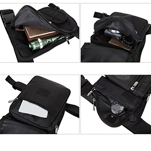 -. Feature : Material is nylon,waterproof and durable to use; / 4 pockets to put phone,money,cards,keys,every mini things you want to put;one main pocket,one front pocket,two zipper pocket;velcro to open and close the front pocket,portable to take or put in; / Portable to carry and light weight,high quality;Size is 5.9"*11.4"*3.15"(Width*Height*Thickness) / There is two straps,one is for waist and one is for drop leg;Make the bag fix to your body,it is cool and comfort;the back of the bag is breathable; / It can be used as waist bag/leg bag;Useful for Motorcycle,Riding,Climbing,Camping,Running,Sport;Hiking;Hunting,Fishing;Outdoor sport
