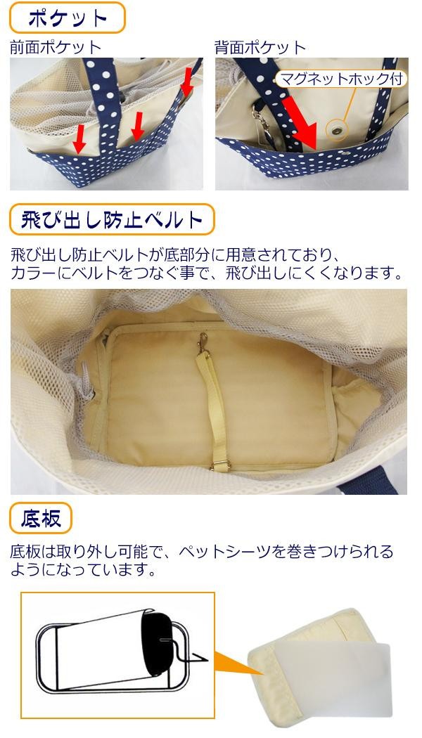 自転車のカゴに入れることができるペットキャリーです。自転車のハンドルに固定できるベルト付き。本体上側はメッシュの巾着になっているので、閉じたままでも中の様子を見ることができます♪本体前面には、持ち手で仕切られたポケットが3箇所、背面にはマグネットホック開閉タイプの大き目ポケットが1箇所ついています。バッグ内には飛び出し防止ベルト付き。底板は取り外し可能なので、ペットシーツを巻きつけることができます |