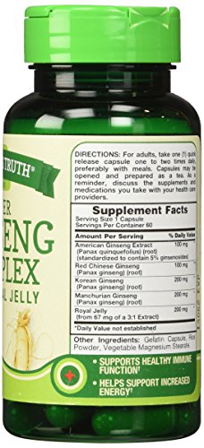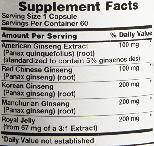 ReleaseDate : 2015-05-11 Studio : Piping Rock Health Products Publisher : Piping Rock Health Products Binding : Health and Beauty Product Description Containing four different types of ginseng, Ginseng Complex Plus Royal Jelly contains naturally occurring ginsenosides and flavonoids, which promote overall well-being . A popular herb utilized in Asian wellness practices, ginseng supports the mind and body's resistance to stress, optimizing immune system function. These statements have not been evaluated by the Food and Drug Administration. This product is not intended to diagnose, treat, cure or prevent any disease. 0