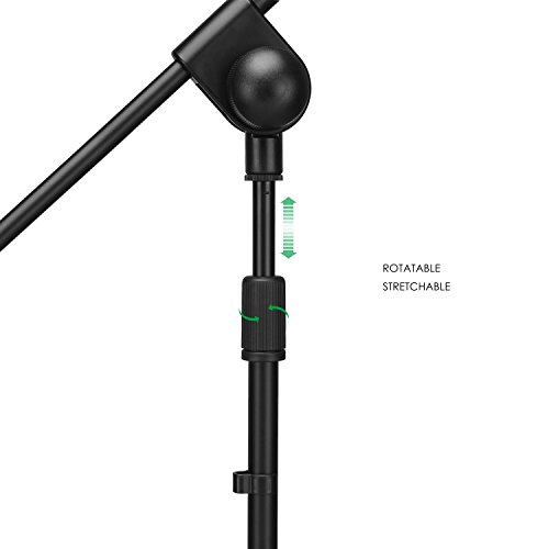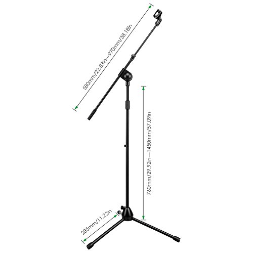 -. Feature : Thread microphone clip, compact and can be used to most vocal and dynamic microphones (diameter from0.78 inch to 1.56 inch). / Collapsible and detachable design, easy to store and carry, the size is 35.73*3.3*2.65 inch when folds up. / The stand based on firm tripod legs and it is well known that triangle is the most stable shape. Super balanced and no risk of falling over. / Adjustable height from 31.2 inch to 62.4 inch. The boom arm of this microphone is 37.83 inch long. Rotates 360 degree. / All tripod legs fitted with PVC tube, no slip on hard surfaces.