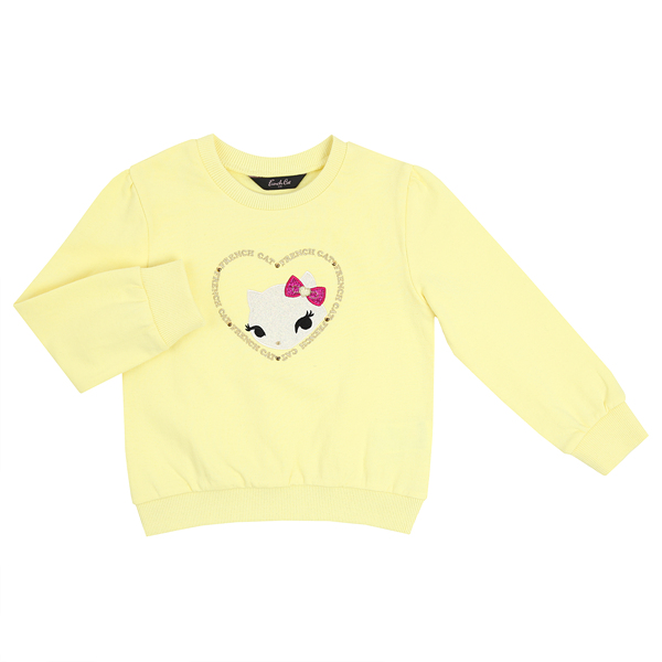 산듯한 엘로우 컬러의 다이마루 소재의 기본 맨투맨 티셔츠 입니다. 하트 속에 쏙 들어간 고양이 포인트로 귀여운 느낌까지 주었습니다. 데님 팬츠와 레깅스와 코디하여 편안하게 입히기 좋은 데일리 아이템입니다.