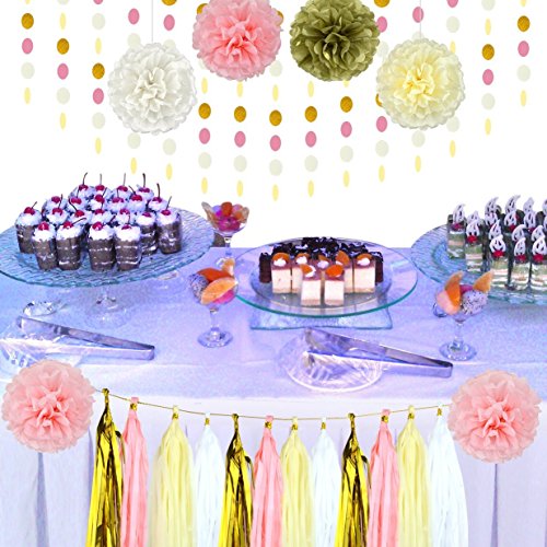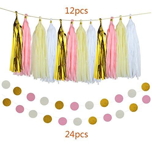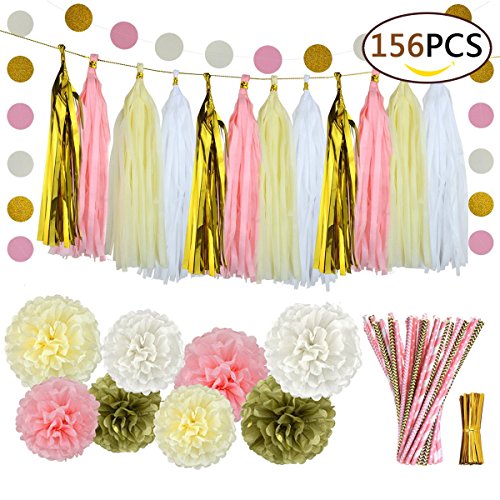 WHAT YOU GET – The party decorations kit includes 12 pcs tassels garland, 8 pcs pom poms paper flowers, 24 pcs circle dot paper garland and 100 pcs paper decoration straws and twist tie 12pcs gold tone.