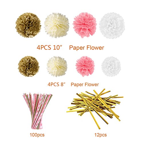 BONUS – 100 pieces paper drinking straws and 24 pieces polka dot garlands are a big bonus for this party favors set. The pink, gold and white color match to the paper tassels and tissue flower perfectly.