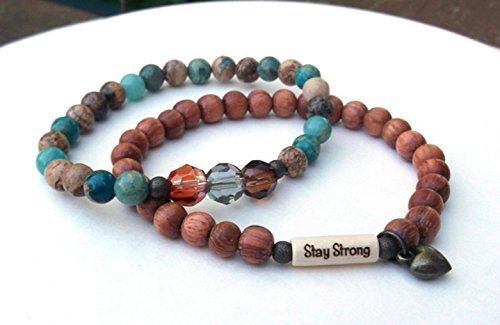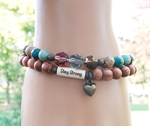 -. Title : Beaded Strength Inspiration Stay Strong Heart Charm Calming Gemstones Set of 2 Boho Bracelets