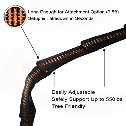 9.5FT Hammock Tree Straps (Set of 2): The hammock tree straps is long enough for adapting to different environment and you can make your hammock more comfortable by easily adjusting the straps. Made of high density polyester, it is non-stretching and safely supports up to 1100 pounds (550 pounds each strap)