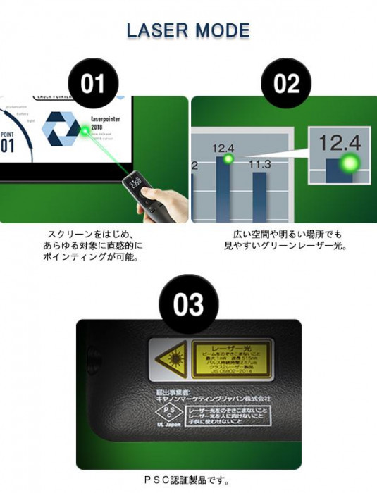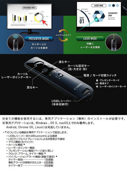 レーザーポインターモード、プレゼンターモードどちらでも使える2wayタイプのポインターです。タイマー機能、バイブレーション機能も搭載しており、講義やビジネスシーンで活躍します!!表面はネイビー、裏面はブラックの落ち着いたカラーです。 |