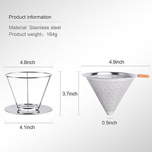 Specifications Item: E-PRANCE reusable pour over coffee filter Size of holder: Height: 3.7inches/9.2cm, Upper Diameter: 4.8inches/12.4cm, Below Diameter: 4.1inches/12cm Size of filter: Height: 3.7inches/9.2cm, Diameter: 4.9inches/12.5cm Brewing capacity: Brew 1-4 cups (about 800ml) Material: 316 stainless steel is used to make the inner net,304 stainless steel is used to make the outer net.