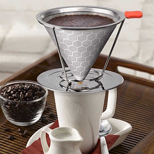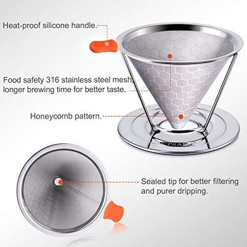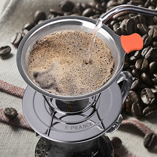 Brewing pour over coffee doesn't always have to be a tedious task meant only for the savviest of baristas - nope! Now you can easily put together your very own home-brewed cup of coffee. Skip the lineup, the expense and the hassle of heading over to the overpriced and the overcrowded. Brew a quality cup for you and your friends in the comfort of your own home with our E-PRANCE pour over coffee dripper! Quality Upgrading There shouldn't be a compromise when it comes to your coffee, and enjoying a cup of coffee shouldn't be a pain. Our E-PRANCE coffee cone dripper is made with a dual filter, twill weave technology to ensure the best brew without any clogging or the annoying papery taste. The 316 stainless steel coffee filter is specifically designed to make sure that all the delicious flavored oils from your grounds are preserved into every cup so you can keep enjoying your coffee after sip! The honeycomb pattern design of outer filter enhance the sense of beauty and taste.