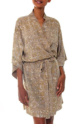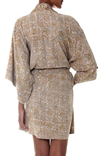 About this item: Autumn jasmine blooms in profusion on a soft cream-colored robe. Designed by Arthur Karvan, the motifs are created by hand with traditional batik techniques. The short robe features 3/4 length sleeves, and wraps and ties with a belt. Due to the nature of the technique, no two robes are ever identical, as the coloring process depends in part on the brightness of the sun. - Hand wash separately in cold water