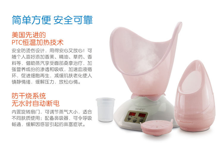 U-Style Facial Face Steamer - Pores Mist Steam Sprayer Spa Sauna Skin RenewalUse for warm steam facial sauna.Soothing steam opens pores help remove dirt, bacteria and makeup residue.Provides a spa treatment that leaves skin soft and silky-smooth.Dual facial sauna cones: wide facial steamer and nasal steamer.Come with a measuring cup.Use:Activate the hydrophilic factor and replenish water in skin.Promote the regeneration of collagen, reduce cracks and restore delicate and smooth skin.Soften the cuticle and improve the absorbency of skin to absorb enough nutrition.Remove metal deposits and weaken pigmented spots so as to maintain your fair complexioned face.Kill skin bacteria and suppress acnes, restore the inherent qualities of your skin.Model: SKG SKJ-518Heating power: 100WRated voltage: 220-230V, 50Hz-60HzPackage size: 22.5 * 20 * 20cmPackage weight: 840g
