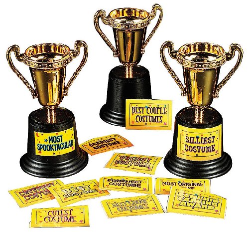 Studio : OTC Publisher : OTC Binding : Toy Product Description Everyone wins with these Halloween costume trophies. Includes 1 dozen trophies and a sheet of 1 dozen assorted label stickers for the following awards: scariest costume, pumpkin carving award, most spooktacular, funniest costume, most original costume, creepiest costume, best costume, best group costumes, cutest costume, best couple costumes, ugliest costume and silliest costume. Plastic. 5" Simple assembly required.